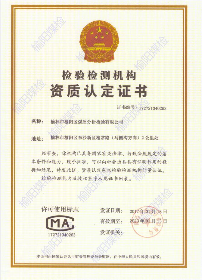 榆林市榆陽區(qū)煤質(zhì)分析檢驗有限公司是一家從事煤炭質(zhì)量檢驗檢測的公司,其前身是陜西省榆林市榆陽區(qū)煤炭公司質(zhì)量檢驗部,成立于2005年,是其內(nèi)設(shè)機(jī)構(gòu)。經(jīng)過十多年的努力與發(fā)展,檢驗室各方面的條件與能力都達(dá)到了一定規(guī)模,并于2016年7月29日由陜西省榆林市榆陽區(qū)煤炭公司出資注冊為獨立法人企業(yè)。2017年1月13日,公司順利通過檢驗檢測機(jī)構(gòu)資質(zhì)認(rèn)定評審工作并取得了由陜西省質(zhì)量技術(shù)監(jiān)督局頒發(fā)的《檢驗檢測機(jī)構(gòu)資質(zhì)認(rèn)定證書》。